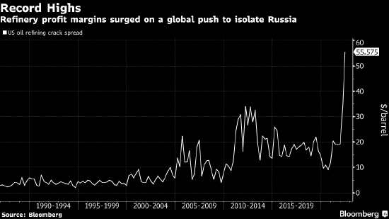 燃油價格飆升,因為孤立俄羅斯(歐洲最重要的供應(yīng)國之一)的努力顛覆了國際市場。在美國駕駛旺季即將到來之際,需求飆升推動煉油利潤率升至非同尋常的高位,有利于包括沙特阿美在內(nèi)的煉油企業(yè)。