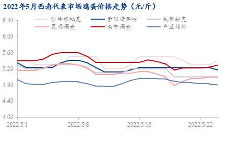 導(dǎo)語:與4月蛋價一路上揚(yáng)大相徑庭,5月西南蛋價跟隨全國大行情,呈現(xiàn)弱勢走低態(tài)勢,截至5月24日,全國主產(chǎn)區(qū)雞蛋均價為4.93元/斤,較月初下跌了2.64%,而西南地區(qū)蛋價跌幅與產(chǎn)區(qū)相差無幾,價格較月初下跌了2.82%。臨近端午,雖有個別產(chǎn)區(qū)想要試探性拉漲,但受制高溫存儲問題,近期價格持續(xù)走弱,加之供應(yīng)端出現(xiàn)增量,后期價格或?qū)⒁椎y漲。