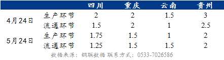 從西南地區(qū)庫存情況來看,本月各環(huán)節(jié)庫存均有所降低,截至5月24日,西南地區(qū)生產(chǎn)環(huán)節(jié)、流通環(huán)節(jié)庫存大多維持在1-2天,其中生產(chǎn)環(huán)節(jié)平均庫存天數(shù)為1.6天,較4月24日減少了0.5天,流通環(huán)節(jié)平均庫存天數(shù)為1.5天,較4月24日減少了0.2天。隨著氣溫回升,南方濕熱天氣尤為明顯,存儲條件不利,迫使生產(chǎn)環(huán)節(jié)積極出貨,而貿(mào)易環(huán)節(jié)多按需采購,庫存基本維持低位,因此各環(huán)節(jié)庫存均有所降低。
