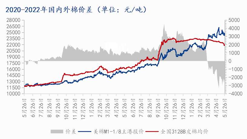 目前國內(nèi)基本面雖疲軟,但內(nèi)外棉價差依舊處于深度倒掛,據(jù)Mysteel農(nóng)產(chǎn)品跟蹤數(shù)據(jù),5月26日美棉M1-1/8到港價為24814元/噸;國內(nèi)3128B皮棉均價為21806元/噸;內(nèi)外棉價差為-3008元/噸。由于近期鄭棉整體跌幅大于美棉,內(nèi)外棉價差呈擴大趨勢。在這種形勢下,鄭棉下方空間有限。