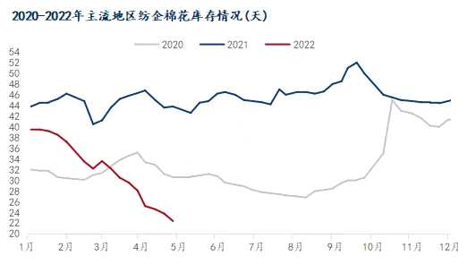 由于2022年紡織行情整體欠佳,訂單不足、成品庫存累積、紡紗利潤多處于虧損,使得紡企對原料采購積極性不高,基本保持隨用隨采的模式,棉花庫存也較同期偏低。據(jù)Mysteel農(nóng)產(chǎn)品數(shù)據(jù)跟蹤,截止4月底,主流地區(qū)紡企棉花庫存折存天數(shù)為22.4天,月環(huán)比減幅20.3%,同比減幅48.8%。