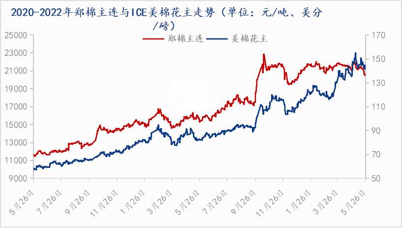 圖1 2020-2022年鄭棉主連與ICE美棉花主走勢
