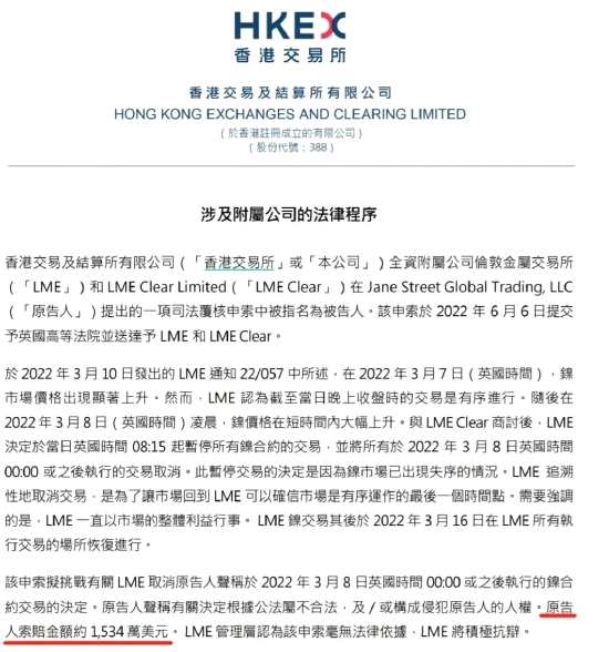 港交所在公告中介紹,此次原告人為Jane Street Global Trading, LLC;該申索于2022年6月6日提交予英國高等法院并送達予LME和LME Clear。