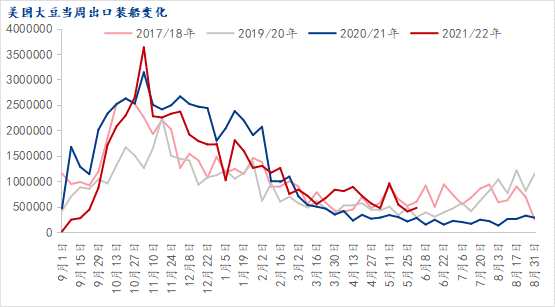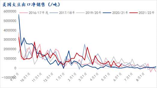 與此同時(shí),從美國(guó)大豆的出口銷(xiāo)售來(lái)看,截至6月2日當(dāng)周,2021/2022市場(chǎng)年度大豆出口凈銷(xiāo)量為42.99萬(wàn)噸,較之前一周顯著增加,較前四周均值增長(zhǎng)41%,達(dá)到此前市場(chǎng)預(yù)估為凈增10-50萬(wàn)噸的高值情況。自5月12日美國(guó)農(nóng)業(yè)部公布的供需報(bào)告以來(lái),美國(guó)大豆出口凈銷(xiāo)售已經(jīng)出現(xiàn)季節(jié)性的回落,周均為39萬(wàn)噸,略低于4月份周均的55萬(wàn),也低于過(guò)去四年同期周均的44萬(wàn)噸。
