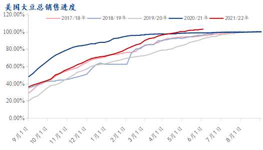 至此,美國(guó)大豆2021/2022年度未完結(jié)的出口銷(xiāo)售量為988.34萬(wàn)噸,加上已裝船的量,美國(guó)大豆的出口銷(xiāo)售總量為5996.05萬(wàn)噸,與5月份USDA對(duì)出口量預(yù)估相比,已經(jīng)完成進(jìn)度的103%;而美國(guó)大豆出口銷(xiāo)售總量完成進(jìn)度的五年均值為97.09%,截止6月2日的美國(guó)大豆銷(xiāo)售總量的進(jìn)度整體也是偏快的。