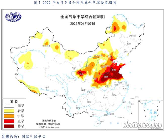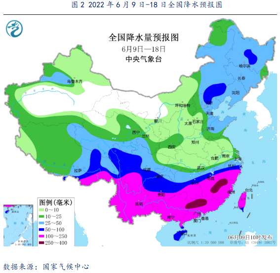 5月以來,河南、山東花生產(chǎn)區(qū)持續(xù)干旱,降水量較往年同期明顯偏少,成為了明顯的氣象干旱特旱區(qū)(如圖1所示),部分花生種植在沒有灌溉設(shè)施的農(nóng)田或丘陵地帶,持續(xù)的氣象旱情對(duì)花生播種和早期生長帶來不利影響,或?qū)笃诨ㄉ鷨萎a(chǎn)造成負(fù)面影響。國家氣候中心6月9日預(yù)測(cè),未來10天,河南、蘇皖北部等地降水仍偏少,氣象干旱將維持或繼續(xù)發(fā)展;山東降雨呈增多趨勢(shì),部分地區(qū)氣象干旱將有所緩和(如圖2所示);未來11-14天(6月19-22日),隨著主雨帶逐步北抬,江淮、江漢累計(jì)降水量有30~60毫米,部分地區(qū)有70~150毫米。華北、東北地區(qū)、黃淮累計(jì)降雨量有10~25毫米,局地30毫米以上。后期天氣將會(huì)成為市場(chǎng)關(guān)注的焦點(diǎn)。