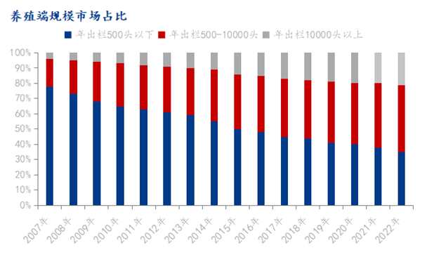 目前行業(yè)以年出欄500投作為規(guī)模場劃分界限,據(jù)公開數(shù)據(jù)顯示,從2007年開始年出欄500頭以下養(yǎng)殖場數(shù)量一直有所下降,截止到2022年下降幅度在70%左右。隨著規(guī)模場抗風(fēng)險(xiǎn)能力的不斷加強(qiáng),以及成本稍有的優(yōu)勢和目前國家政策的指引,規(guī)模企業(yè)未來會(huì)不斷的提升,后續(xù)規(guī)模養(yǎng)殖企業(yè)的成本優(yōu)勢也會(huì)在各種豬場設(shè)計(jì),飼料配方以及各種費(fèi)用方面凸顯。