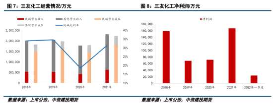 2021年市場景氣度好,三友化工主導產(chǎn)品純堿、粘膠、燒堿、PVC、有機硅產(chǎn)品售價均大幅上漲。2021年共實現(xiàn)營業(yè)收入2318224.92萬元,其中純堿營業(yè)收入占26.97%,為625148.79萬元;實現(xiàn)屬于上市公司股東的凈利潤167100.67萬元,同比增長133.04%;其中純堿毛利率為31.47%,較2020年增加12.94%。2022年第一季度實現(xiàn)營業(yè)收入587177.73萬元,同比增長4.21%;實現(xiàn)屬于上市公司股東的凈利潤24032.65萬元,同比下降59.54%。