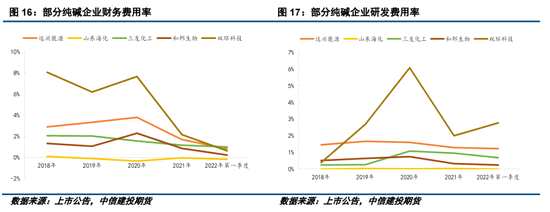 受新收入準則影響,部分費用(主要為與合同履約相關的運輸費用)計入營業(yè)成本中,2020年開始企業(yè)銷售費用出現(xiàn)較為明顯的下降。根據(jù)年報披露數(shù)據(jù),2020年純堿企業(yè)銷售費用率在1.0-2.5%之間,2021年在0.5-1.5%之間,2022年第一季度基本與2021年持平。除會計準則變更影響外,純堿價格上漲、企業(yè)業(yè)績改善也使得成本呈現(xiàn)下降趨勢。2021年國內(nèi)疫情得到有效控制,宏觀經(jīng)濟呈復蘇態(tài)勢,純堿需求改善帶動價格上漲,純堿企業(yè)營業(yè)收入和凈利潤增加,管理費用率和財務費用率出現(xiàn)較大程度下滑。而研發(fā)費用率方面,純堿企業(yè)的研發(fā)費用率較為穩(wěn)定,各家企業(yè)的差距也不大。