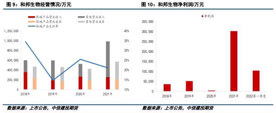 受益于產(chǎn)品價格上漲及客戶擴展和銷量增加,和邦生物2021年共實現(xiàn)營業(yè)收入986710.91萬元,其中聯(lián)堿產(chǎn)品收入占比為36.37%,為358887.59萬元;實現(xiàn)屬于上市公司股東的凈利潤302330.62萬元,同比增長7284.28%;其中聯(lián)堿產(chǎn)品毛利率為34.44%,相較于2020年增加19.69%。2022年第一季度實現(xiàn)營業(yè)收入308613.65萬元,同比增長85.43%;實現(xiàn)屬于上市公司股東的凈利潤104272.54萬元,同比增長323.44%。