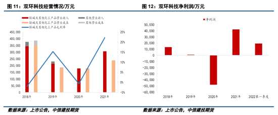 受純堿價格上漲影響,2021年雙環(huán)科技共實現(xiàn)營業(yè)收入306376.02萬元,其中聯(lián)堿及其他化工產(chǎn)品收入占99.89%,為306042.52萬元;實現(xiàn)屬于上市公司股東的凈利潤42260.47萬元,同比增長187.89%;其中聯(lián)堿及其他化工產(chǎn)品毛利率為22.27%,較2020年增加22.97%。2022年第一季度實現(xiàn)營業(yè)收入102813.25萬元,同比增長100.20%;實現(xiàn)屬于上市公司股東的凈利潤19242.62萬元,同比增長603.65%。