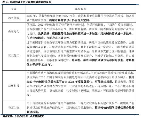 整理上市公司年報可知,企業(yè)對2022年行情普遍持有較為樂觀的態(tài)度,大多數(shù)企業(yè)認為2022年純堿市場整體將好于2021年。企業(yè)認為浮法玻璃對純堿需求或略有下降,但碳中和背景下,光伏玻璃持續(xù)投產(chǎn)將帶來較為明顯的增量需求,碳酸鋰產(chǎn)量不斷增加也將帶動純堿需求增加。以下是企業(yè)年報當中關于2022年純堿市場的具體看法。