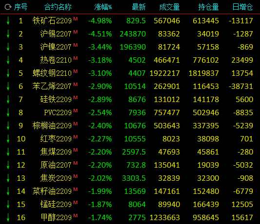 摘要: 6月17日,國內(nèi)期貨主力合約早盤多數(shù)下跌。鐵礦石跌近5%,滬錫跌超4%,滬鎳、熱卷、螺紋鋼跌超3%,苯乙烯、硅鐵跌近3%,