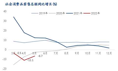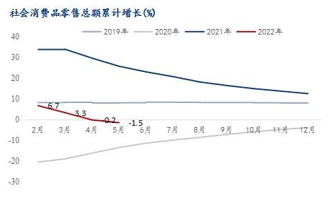 3月底以來,國內(nèi)疫情爆發(fā),多處地方防控嚴格,人們購買力也出現(xiàn)下降趨勢,社會消費品銷售面臨窘境,其零售總額同比增長、累計增長皆處于負數(shù)。據(jù)國家統(tǒng)計局數(shù)據(jù)顯示,2022年5月,社會消費品零售總額同比增長為-6.7%,環(huán)比上月收窄4.4%;2022年1-5月社會消費品零售總額累計增長為-1.5%,環(huán)比上月擴大1.3%。從最新數(shù)據(jù)來看,社會消費品月度數(shù)據(jù)雖有修復(fù),但整體仍處于疲軟態(tài)勢。