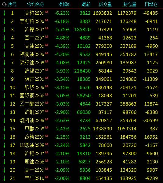6月23日,國(guó)內(nèi)商品期貨早盤多品種大幅下挫,有色金屬,農(nóng)產(chǎn)品(000061)期貨跌幅居前。菜粕、豆粕跌超6%,滬鎳跌超5%,豆二、豆油、棕櫚、菜油跌超4%;漲幅方面,20號(hào)膠、硅鐵、橡膠漲超1%。