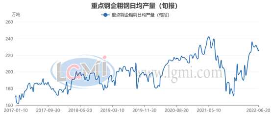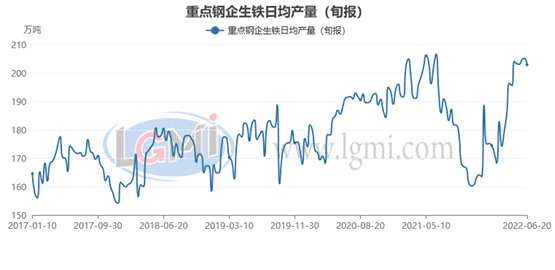 據(jù)中國鋼鐵工業(yè)協(xié)會統(tǒng)計數(shù)據(jù)顯示,2022年6月中旬重點鋼企生鐵日均產(chǎn)量202.92萬噸,旬環(huán)比下降1.12%,同比下降1.78%;6月中旬重點鋼企粗鋼日均產(chǎn)量225.79萬噸,旬環(huán)比下降1.34%,同比下降5.74%;6月中旬重點鋼企鋼材日均產(chǎn)量220.46萬噸,旬環(huán)比上升1.50%,同比下降3.51%。