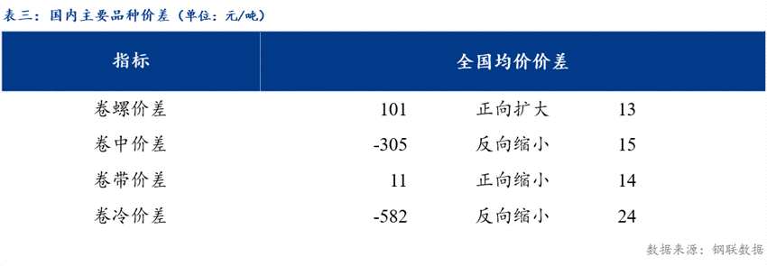 從品種價差來看,卷螺差較上一交易日擴大13元/噸,熱中價差較上一交易日反向縮小15元/噸,熱帶價差較上一交易日縮小14元/噸,熱冷價差較上一交易日反向縮小24元/噸。