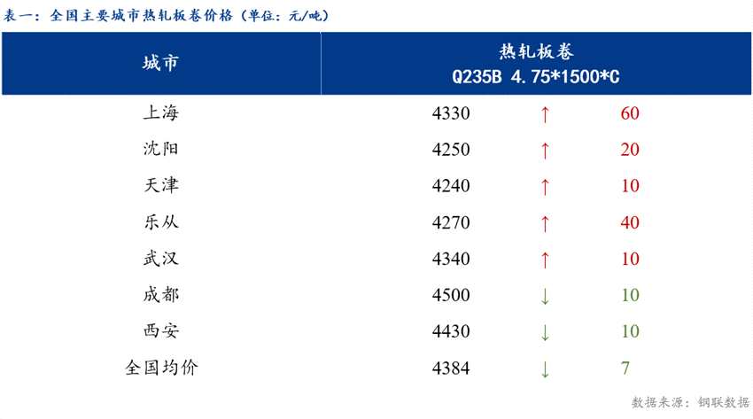截止發(fā)稿時3.0mm熱軋板卷全國均價4455元/噸,較上個交易日下跌6元/噸。4.75mm熱軋板卷全國均價4384元/噸,較上個交易日下跌7元/噸。其中主要城市價格為上海4330元/噸,沈陽4250元/噸,天津4240元/噸,樂從4270元/噸,武漢4340元/噸,成都4500元/噸,西安4430元/噸。