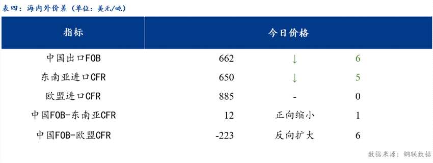 從海內外價差情況來看,中國熱卷出口維持在662美元/噸左右,歐盟進口價格885美元/噸,較昨日持平。中國與歐盟價差反向擴大6美元/噸。