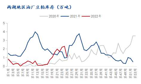 從需求方面看,據(jù)Mysteel統(tǒng)計(jì),6月兩湖地區(qū)油廠提貨量大體呈現(xiàn)平穩(wěn)走勢(shì),前期因武漢一油廠停機(jī)、后期因部分油廠壓榨菜籽提貨量處于低位。本月兩湖地區(qū)大豆庫(kù)存連續(xù)三周保持上升趨勢(shì),最高值為11.3萬噸,遠(yuǎn)遠(yuǎn)超過去年同期。而豆粕庫(kù)存同樣到達(dá)最高點(diǎn)2.3萬噸,但第25周,大豆、豆粕庫(kù)存紛紛出現(xiàn)拐點(diǎn)。這表明整體下游需求還是尚可,7月將迎來水產(chǎn)旺季,需求將會(huì)進(jìn)一步好轉(zhuǎn)。