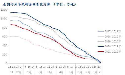 截止到6月30日,全國冷庫蘋果剩余量在109.33萬噸,較上周環(huán)比減少14.15萬噸,減幅11.46%。目前西北大部分產(chǎn)區(qū)交易基本結(jié)束,甘肅產(chǎn)區(qū)交易進(jìn)入尾聲,剩余貨源多集中在當(dāng)?shù)卮笮凸麡I(yè)公司及個別客商手中,多通過自有渠道發(fā)貨,陜西產(chǎn)區(qū)貨源多集中在洛川產(chǎn)區(qū),剩余貨源不多,部分存儲中后期貨源客商出貨意愿增強,存儲前期好貨客商仍等待后市行情,庫內(nèi)貨源以客商按需自提發(fā)貨為主;山東產(chǎn)區(qū)貨源多集中在桃村、蛇窩泊等客商存貨較多的產(chǎn)區(qū),果農(nóng)存貨占比高的產(chǎn)區(qū)冷庫也陸續(xù)清庫,總的來看,目前全國冷庫庫存量處于偏低位置,對蘋果價格形成一定支撐。