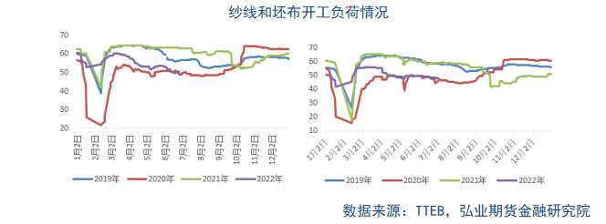 今年以來(lái),棉紡織行業(yè)PMI指數(shù)一直處于近年同期最低。5月份,棉紡織行業(yè) PMI 指數(shù)為44.74,環(huán)比增加12.58,同比回落9.56,為近三年同期最低值。其中,新訂單指數(shù)為 35.96,處于近年歷史較低位。3月中旬以來(lái),國(guó)內(nèi)紗線和坯布開工負(fù)荷呈震蕩回落走勢(shì),且今年基本上處于往年同期最低位(除卻2020年),而兩者庫(kù)存則從4月份加速上升,今年以來(lái)一直處于近年同期最高位。截至6月底,紗線和坯布開工負(fù)荷指數(shù)分別為48.9和48.3,較去年同期分別回落14個(gè)11個(gè)百分點(diǎn);紗線和坯布庫(kù)存分別為34.4天和37.3天,較去年同期分別上升21天和22天。