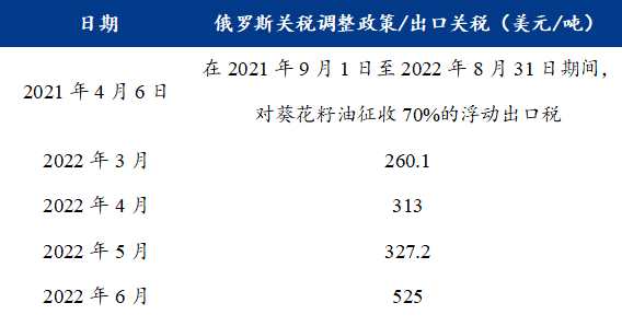 俄羅斯葵油自2022年4月1日起開始引入出口配額制度,總額為150萬噸??蜕a(chǎn)商(以葵油生產(chǎn)商歷史生產(chǎn)出口數(shù)量為分配配額的標準),直到季節(jié)結(jié)束,配額外葵油出口關稅提高70%,且不低于每噸1000美元。俄羅斯作為葵花籽油第二大葵油主產(chǎn)國及出口國,其為穩(wěn)定自身國內(nèi)市場葵花籽油的價格,以及確保滿足本國加工企業(yè)對原材料的需求,多次上調(diào)葵花籽油出口關稅??ㄗ延瓦M口成本增加,國內(nèi)葵花籽油價格勢必也會有所上漲。