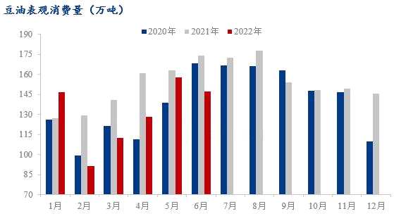 按照2022年6月中國(guó)進(jìn)口1萬(wàn)噸豆油,出口0.8萬(wàn)噸豆油預(yù)估,根據(jù)Mysteel農(nóng)產(chǎn)品測(cè)算,2022年6月中國(guó)豆油表觀消費(fèi)量146.88萬(wàn)噸,較5月減少10.86萬(wàn)噸,環(huán)比下降6.88%。2022年1-6月累計(jì)豆油表觀消費(fèi)量783.75萬(wàn)噸,比去年同期895.09萬(wàn)噸,大幅減少111.34萬(wàn)噸,同比降幅達(dá)12.44%。
