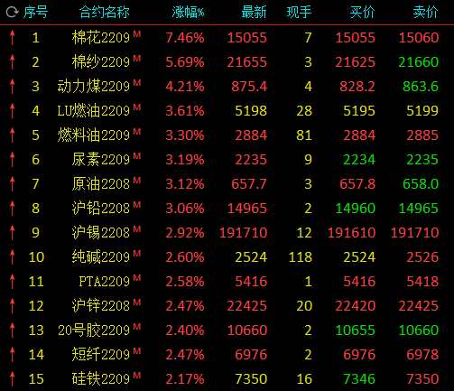 7月18日,國內(nèi)期市開盤多品種上漲,棉花漲逾7%,尿素、SC原油漲逾3%。