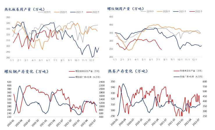 從二季度至今的產(chǎn)量變化來看,螺紋鋼自6月17日開始持續(xù)性減量,截至7月15日累計(jì)減產(chǎn)48.4萬噸;總庫存自6月24日開始持續(xù)性降庫,6月至今累計(jì)降庫153.8萬噸。熱軋板卷7月8日開始減量?jī)芍?,截?月15日累計(jì)減產(chǎn)4.7萬噸;總庫存僅7月11日微降2.1萬噸,6月至今累計(jì)增庫28.9萬噸。如此看來,二者對(duì)于基本面緩和所做的努力并不趨同。