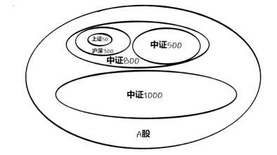 上證50指數(shù)包括了滬市市值最大、流動(dòng)性最好的50家公司,它是滬市藍(lán)籌權(quán)重的代表。滬深300指數(shù)包括了A股市值最大、流動(dòng)性最好的300家公司,它是A股里的“重點(diǎn)班”。中證500指數(shù)包括了A股市值、流動(dòng)性排名301-800的500只股票,它是中小成長(zhǎng)公司的代表。中證1000指數(shù)包括了A股市值、流動(dòng)性排名801-1800的1000只股票,它是小型成長(zhǎng)公司的典型代表。根據(jù)以上描述,可以清晰得出四大指數(shù)之間的關(guān)系如圖1所示。