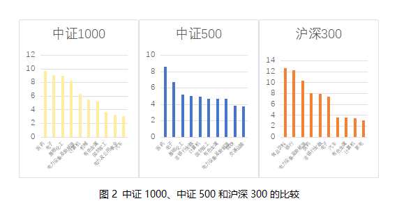 中證1000指數(shù)在所有寬基指數(shù)中被定位成小盤股指數(shù),它前十名的行業(yè)組成由圖2所示。它的特點(diǎn)如下分析所示。