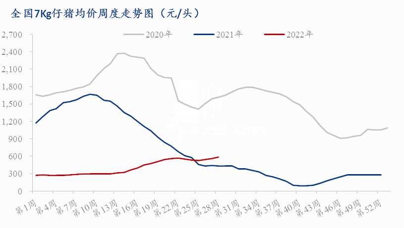 截止到7月22日,7公斤斷奶仔豬均價(jià)為674.29元/頭,較上周上漲87.86元/頭,環(huán)比上漲14.98%,同比上漲55.95%。本周仔豬價(jià)格漲幅較大,整體上漲50-100元/頭,市場主流價(jià)格為650-720元/頭。生豬行情仍高位震蕩,養(yǎng)殖端對(duì)后市預(yù)期持續(xù)向好,補(bǔ)欄留種積極性仍有提升。不過仔豬成交多為規(guī)模場采購,市場流通量較為有限,部分區(qū)域報(bào)價(jià)大漲仍顯有價(jià)無市。短期來看,養(yǎng)殖端情緒仍較積極,仔豬市場行情持續(xù)上移,價(jià)格仍偏強(qiáng)態(tài)勢運(yùn)行。在仔豬供應(yīng)量相對(duì)較充足情況下,仔豬價(jià)格的上漲可見到部分養(yǎng)殖企業(yè)整體補(bǔ)欄的積極性仍然較高。