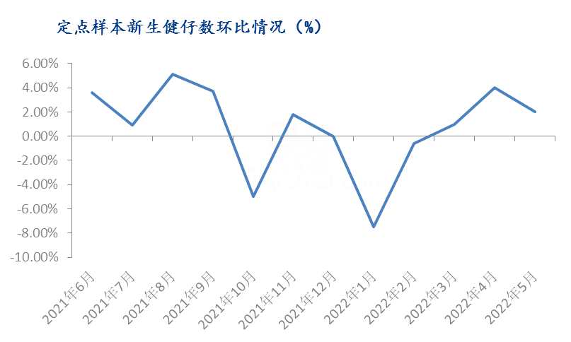 據(jù)定點(diǎn)樣本企業(yè)新生健仔數(shù)數(shù)據(jù)顯示,從2022年2月份開始,仔豬新生數(shù)量呈現(xiàn)上漲趨勢,在5月份左右,仔豬數(shù)量也呈現(xiàn)較高水平,市場對(duì)后市整個(gè)豬價(jià)相對(duì)較為樂觀,市場補(bǔ)欄情況也較為積極。