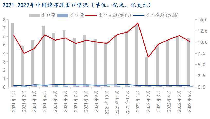 2022年1-6月中國棉布出口金額62.65億美元,較2021年同期增加3.42%,出口量33.37億米,同比減少13.40%。中國1-6月棉布進(jìn)口金額2.13億美元,同比減少13.40%,進(jìn)口量0.64億米,同比減少34.01%。2022年1-6月中國紡織品服裝累計(jì)出口金額1564.89億美元,同比增長11.66%,其中紡織品累計(jì)出口金額763.19億美元,同比增加11.32%,服裝累計(jì)出口金額801.71億美元,同比增加11.98%。雖然1-6月紡織品服裝出口金額同比大增,但從棉布出口金額同比增加、出口量同比減少,以及后者減幅高于前者增幅來看,推算1-6月紡織服裝出口數(shù)量亦表現(xiàn)為減少。