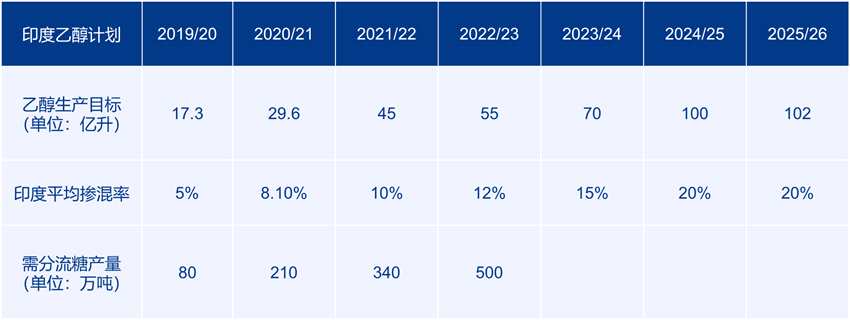 22/23 年度,全印度平均乙醇汽油摻混率將提升至 12%乙醇產量目標提升至 55 億升,意味著將有 500 萬噸糖進入到乙醇產業(yè)。2025 年乙醇摻兌目標將提高至 25%,其中逾半數的乙醇將會來自于甘蔗糖分,用于生產乙醇的糖量將越來越大,到 2025 年乙醇業(yè)消耗糖量預計達到 600 萬噸以上,未來幾年印度可供出口量預計將逐年減少。