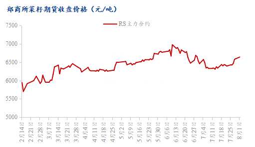 菜籽期貨方面,ICE油菜籽以及菜籽內(nèi)盤主力合約均連續(xù)上漲,主要受美豆天氣以及美聯(lián)儲加息影響,截至8月1日,菜籽內(nèi)盤主力合約收于6640元/噸,環(huán)比上周上漲214元/噸,漲幅3.3%。