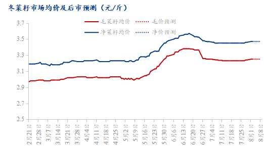 菜籽市場仍處于傳統(tǒng)淡季,本次價格的小幅回升并未帶動行情由弱轉旺,以安徽市場為例,價格僅上調(diào)60元/噸,走貨速度便開始減緩,菜籽淡季時期的弱勢行情并未得到實質(zhì)性改善,還需等待中秋前的行情回升,且美豆天氣炒作極不穩(wěn)定,或迎來另一波利空行情。綜上所述,短期內(nèi)菜籽價格或回歸平穩(wěn)狀態(tài),市場購銷節(jié)奏依然緩慢。