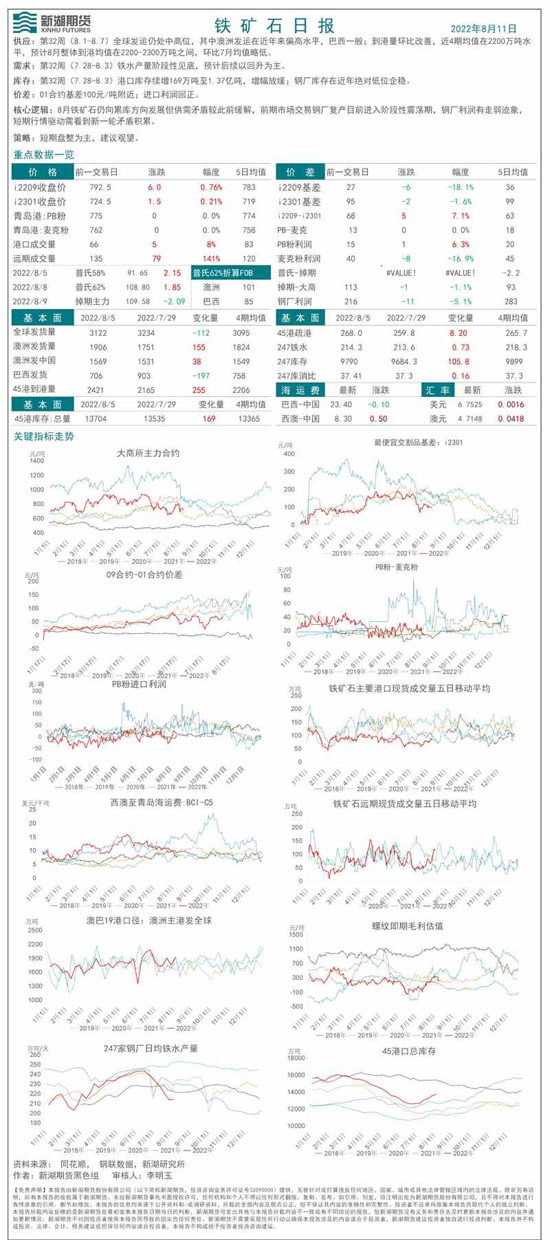 昨日夜盤前美國通脹數(shù)據(jù)迎來拐點(diǎn),短期加息預(yù)期降溫,或?qū)ι唐穾硪欢ɡ?。鐵礦方面現(xiàn)貨端山東主港pb粉775平,麥克粉762平,近期成交階段有好轉(zhuǎn);01合約基差100元/噸附近;進(jìn)口利潤回正。供應(yīng)方面,第32周(8.1-8.7)全球發(fā)運(yùn)仍處中高位,其中澳洲發(fā)運(yùn)在近年來偏高水平,巴西一般;到港量環(huán)比改善,近4期均值在2200萬噸水平,預(yù)計(jì)8月整體到港均值在2200-2300萬噸之間,環(huán)比7月均值略低。需求方面,第32周(7.28-8.3)鐵水產(chǎn)量階段性見底,預(yù)計(jì)后續(xù)以回升為主。庫存方面,第32周(7.28-8.3)港口庫存續(xù)增169萬噸至1.37億噸,增幅放緩;鋼廠庫存在近年絕對低位企穩(wěn)。8月鐵礦石仍向累庫方向發(fā)展但供需矛盾較此前緩解,前期市場交易鋼廠復(fù)產(chǎn)目前進(jìn)入階段性震蕩期,鋼廠利潤有走弱跡象,短期行情驅(qū)動需看到新一輪矛盾積累,建議觀望。