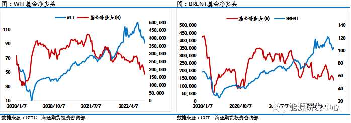 從2021年6月之后,國際原油市場整體持倉就持續(xù)下滑,而今年俄烏沖突之后,油價波動的高度不確定性進一步導致更多投資者離場觀望,到目前為止WTI原油持倉仍在進一步下滑,盤面流動性不足經(jīng)常導致油價突發(fā)波動,這也加大了投資者交易難度。雖然仍然有機構繼續(xù)堅定看漲立場,但可以看到不管是WTI還是布倫特原油專業(yè)機構的凈多持倉都在持續(xù)減少,尤其是WTI原油的基金凈多頭寸更是隨著此次油價大跌過程持續(xù)快速減少,顯然從資產(chǎn)配置角度來講,機構一直大幅減少對原油的多頭配置,此次油價觸頂回落之后這一動作進一步加速。而對于油價來說無論從宏觀層面還是下半年原油市場自身供需角度,都已經(jīng)不具備之前2年油價持續(xù)上漲的條件。