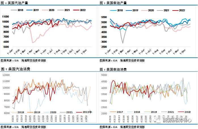 IEA月報則對前期過度悲觀的預期進行了適當?shù)男拚?,上調(diào)了需求預期,6月份全球石油庫存減少了500萬桶,歐洲高溫天氣刺激石油需求,上調(diào)2022年全球石油需求增長預測至9970萬桶/日,將2022年全球石油需求增長預測上調(diào)38萬桶/日至210萬桶/日。預計2022年全球石油供應將增加480萬桶/日至1億桶/日, 俄羅斯石油供應量的減少比此前預測的更為有限,俄羅斯7月石油出口量下降11.5萬桶/日,從年初的約800萬桶/日降至740萬桶/日。7月份,歐佩克國家減產(chǎn)執(zhí)行率為523%,俄羅斯為719%。7月份煉油廠產(chǎn)量增加110萬桶/日,8月份增加35萬桶/日,預計2023年全球石油供應量為1.017億桶/日。2023年全球石油需求將增加210萬桶/日,達到超過新冠肺炎爆發(fā)前的1.018億桶/日。將2022年非歐佩克產(chǎn)油國供應預期維持在6550萬桶/日不變,油價上漲掩蓋了其他行業(yè)在經(jīng)濟下行中相對疲弱的表現(xiàn)