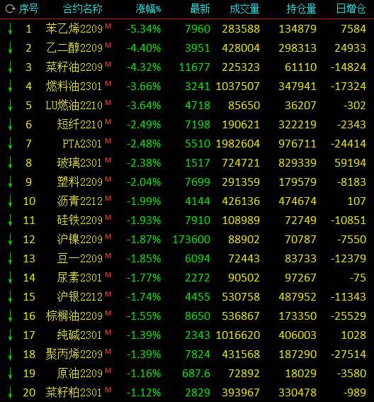 期貨收盤多數品種下跌:苯乙烯跌超5%,乙二醇、菜籽油跌超4%
