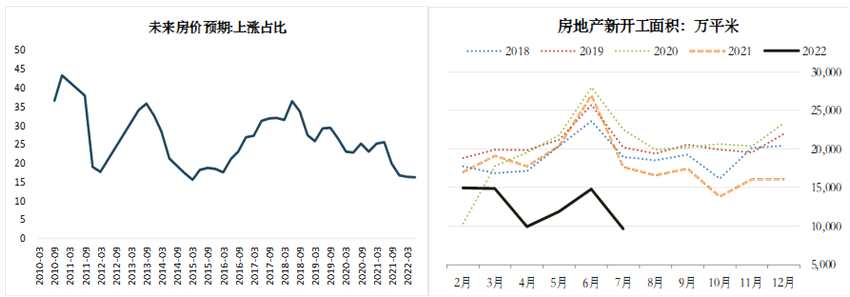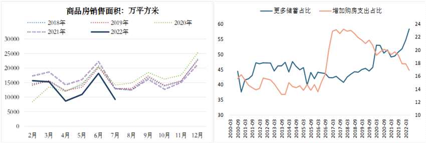 房地產(chǎn)方面,商品房銷售的弱勢從居民中長期貸款數(shù)據(jù)可以提前感受,7月國內(nèi)商品房銷售面積環(huán)比減少49%,近乎腰斬,季節(jié)性表現(xiàn)為近5年最弱,同比減少28.9%,高于前值18.3%。二季度央行調(diào)查顯示,居民未來3個月預(yù)計增加購房支出的占比降至16.9%,儲蓄占比創(chuàng)歷史新高,同時對未來房價上漲的預(yù)期持續(xù)回落,僅高于2015年最低值。預(yù)期較差以及對停工的擔(dān)憂,使年初以來政策對地產(chǎn)銷售端的刺激效果有限,6月短暫回升后,7月銷售繼續(xù)下滑,8月前兩周延續(xù)弱勢。7月銷售資金來源占房企資金來源總額的48%,而銷售的弱勢使房企資金端壓力依然較大,影響拿地及新開工能力和意愿,7月房地產(chǎn)新開工面積同比減少45.4%,降幅擴(kuò)大,施工和竣工也未明顯改善,地產(chǎn)整體均受資金影響。保交樓背景下,政策相對積極但并未超預(yù)期,1-7月房地產(chǎn)新開工面積同比減少36%。近期出臺政策較多,截至目前實質(zhì)性的效果還有限,后續(xù)還要繼續(xù)關(guān)注。