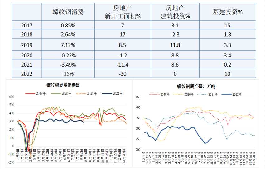 7月以來螺紋鋼需求表現(xiàn)平穩(wěn),季節(jié)性上則要好于過去幾年同期,但周均300萬噸的消費(fèi)量仍較低,房地產(chǎn)新開工及施工面積增速截至目前改善不大,對9月以后的螺紋需求仍是潛在利空。以房地產(chǎn)和基建的數(shù)據(jù)去粗略估算螺紋鋼需求,參考2017-2021年的數(shù)據(jù),2022年在-30%房地產(chǎn)新開工增速及10%的基建投資增速下,螺紋鋼消費(fèi)量同比至少要減少10%以上,中性情況下可能減少15%,由于2021年下半年至今的一年時間內(nèi),國內(nèi)房地產(chǎn)新開工同比大幅下降,存量新開工及施工均要少于2021年之前,可能使今年新開工大幅回落對螺紋需求影響更大。在全年10%到15%的需求降幅之下,對應(yīng)9月以后螺紋鋼周度消費(fèi)量在280-320萬噸之間。