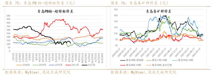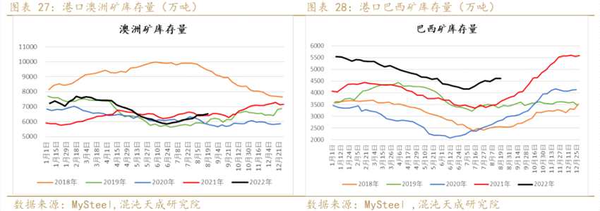 3. 澳巴庫(kù)存:本周澳礦庫(kù)存環(huán)比上升80.17萬(wàn)噸至6522.94萬(wàn)噸,高于去年同期水平。巴西礦庫(kù)存略有下降,環(huán)比減少4.45萬(wàn)噸,仍處于近年同期的高位。