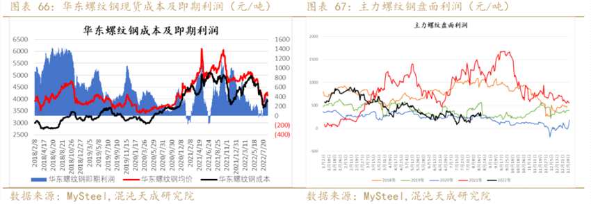 3. 螺紋鋼現(xiàn)貨及盤面利潤(rùn):由于鋼價(jià)回落成本上漲,本周模型測(cè)算的北方及華東螺紋即期利潤(rùn)均有收窄,利潤(rùn)空間降至200-350區(qū)間,同期主力螺紋盤面利潤(rùn)小幅震蕩,變動(dòng)不大。
