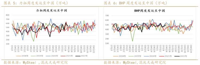 上周力拓發(fā)運(yùn)至中國(guó)的量小幅回落;BHP至中國(guó)的發(fā)運(yùn)量有小幅上升,二者均處同期高位。