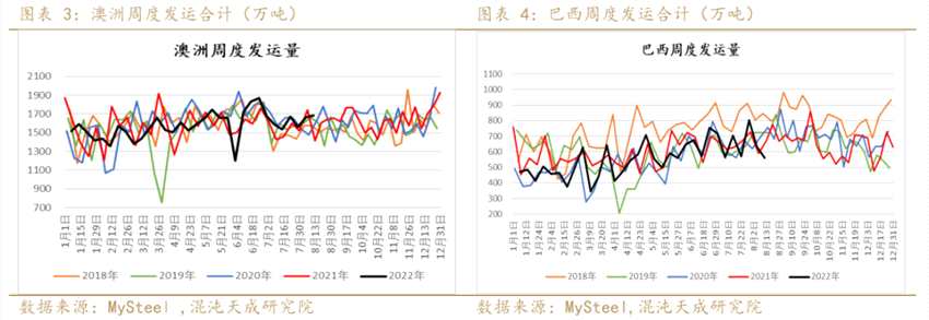 上周澳洲發(fā)運(yùn)略有增加,環(huán)比增14萬(wàn)噸;但巴西發(fā)運(yùn)環(huán)比繼續(xù)下降72.6萬(wàn)噸至同期最低。