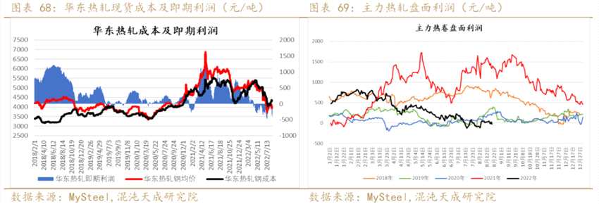 4. 熱軋現(xiàn)貨及盤面利潤(rùn):因熱卷價(jià)格跌幅較大,成本也小幅增加,本周模型測(cè)算的北方及華東熱卷即期虧損均有擴(kuò)大,虧損空間升至150-400區(qū)間,且主力熱卷盤面利潤(rùn)仍處同期低位。