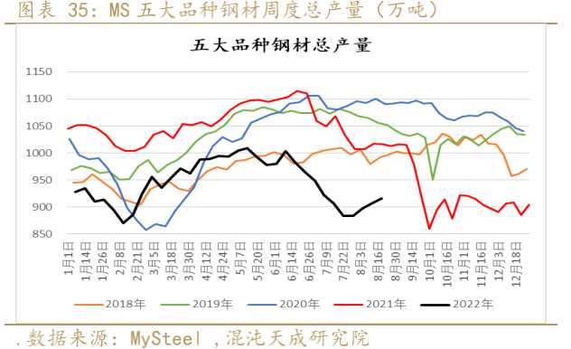 本周五大品種周產(chǎn)量環(huán)比增加9.15萬(wàn)噸至915.42萬(wàn)噸,但同比仍降100.17萬(wàn)噸。